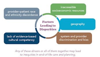 Inequities that historically underserved communities face at the end-of-life are a continuation of the inequities faced throughout their life. The figure below outlines some of the most common factors driving disparities–one factor or all of them together may lead to inequities in end-of-life planning and care. As an example: