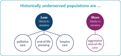 And more likely to receive aggressive end-of-life care that does not increase, and may reduce, quality of life.1 Individuals with different beliefs may choose different levels of care. However, those preferences should come as a result of fully informed decision making, not as a result of systemic inequities in the healthcare system that results in lack of awareness and access to available options. See figure below as well as these data slides.